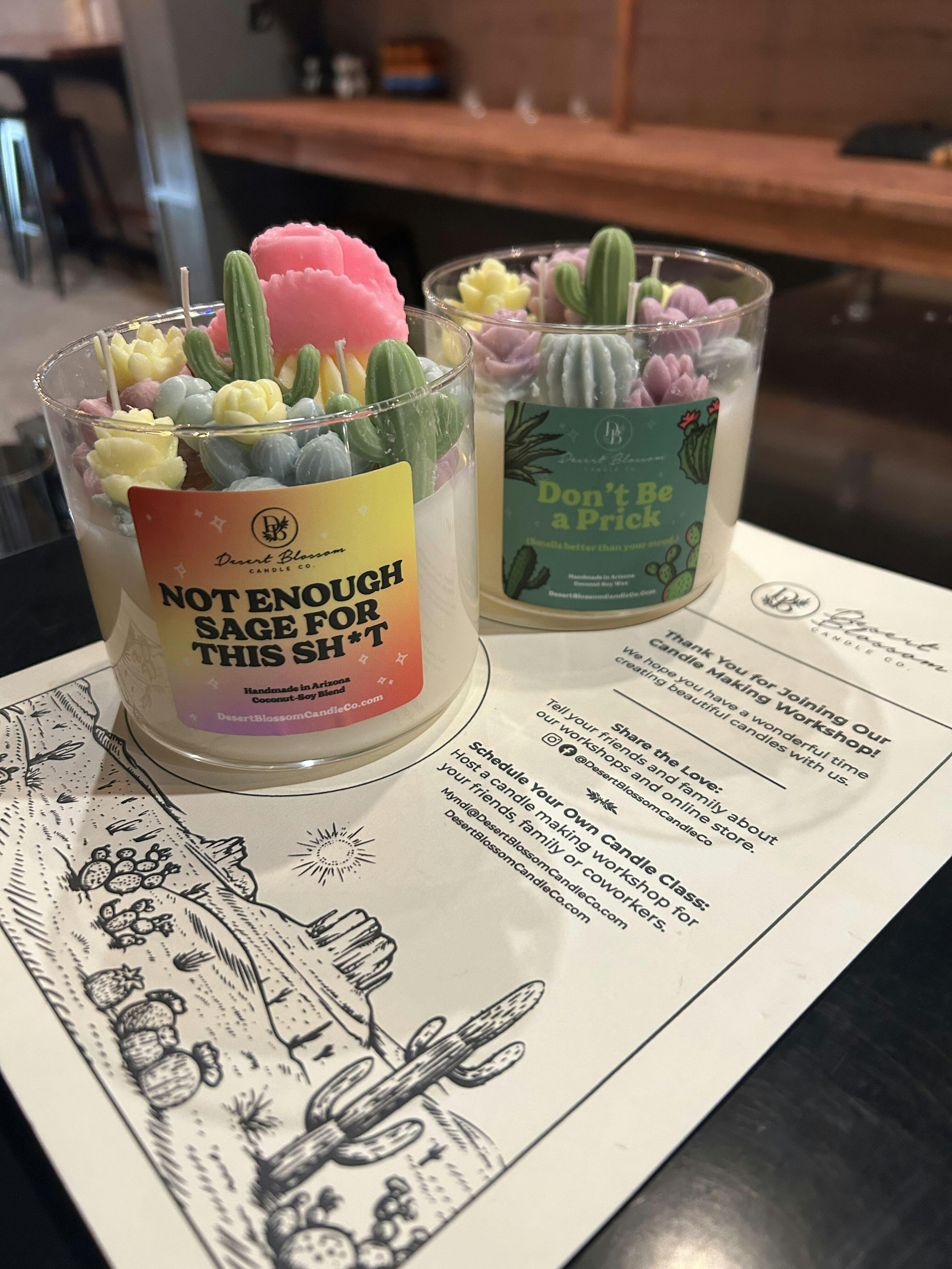You’ll start by choosing from two coffee blends or four matcha creations, then customize every detail to make it uniquely yours. Learn how to cut realistic “ice cubes” from gel wax, mix candle safe dyes to match your favorite drink, and hand pour your custom scent into a beautiful 16 ounce vessel. Finish it off with your own personalized label for that perfect finishing touch.