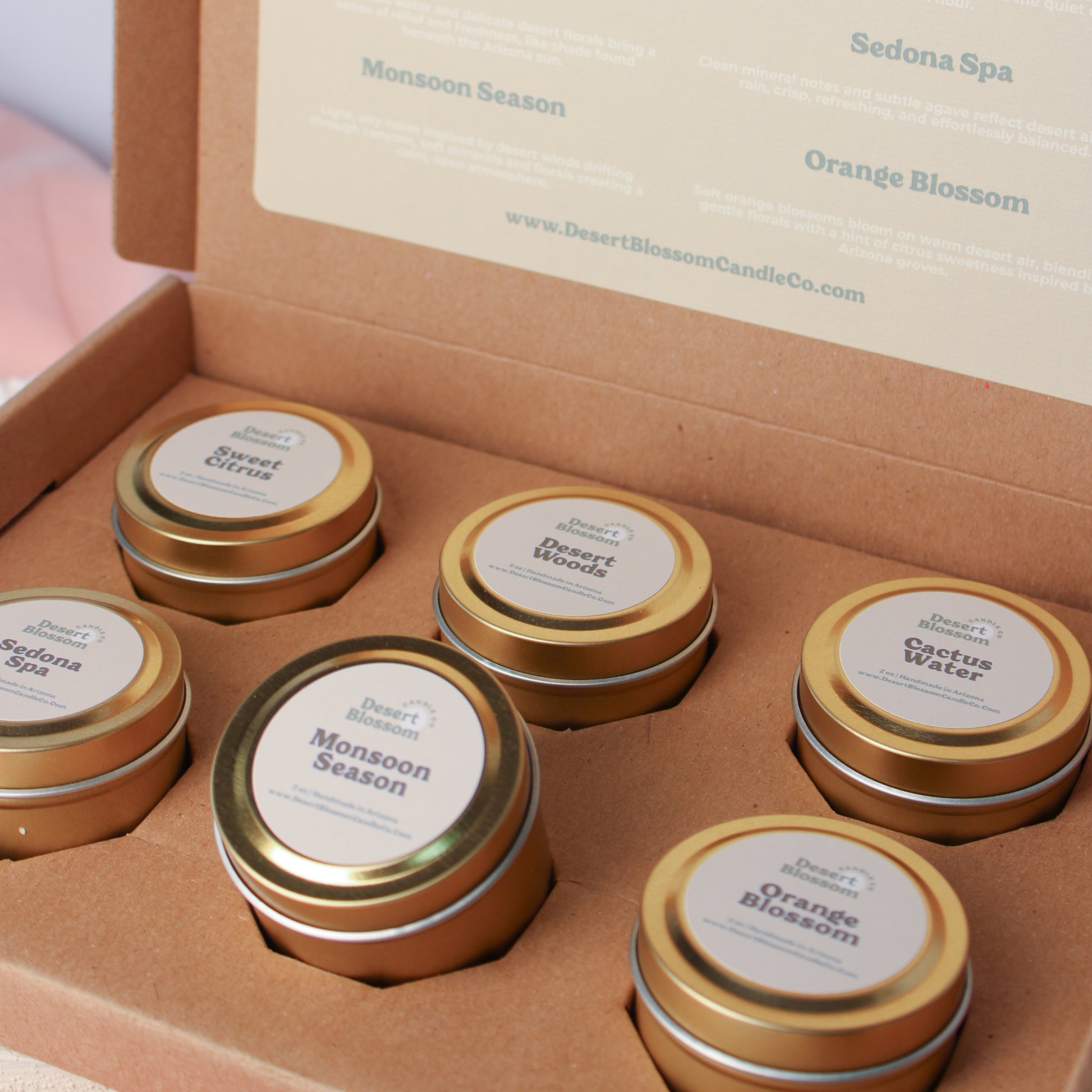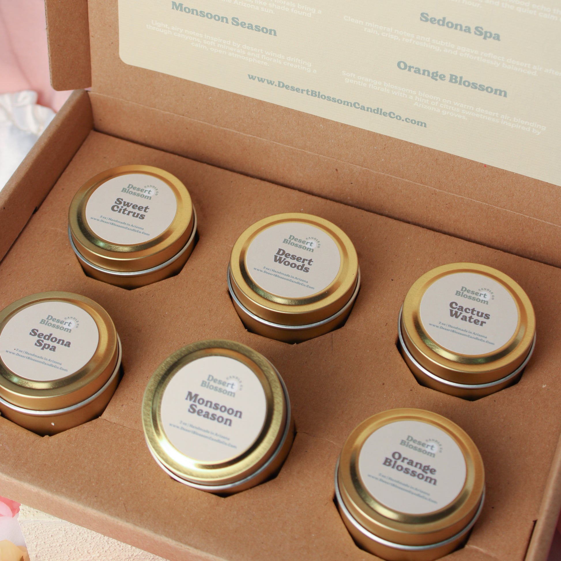 Explore the heart of our Desert Collection with this curated 2 oz candle sample set. Inspired by warm air, open landscapes, and moments of calm found in the desert, this collection blends fresh citrus, soft florals, grounding woods, and airy notes designed to feel both refreshing and grounding.