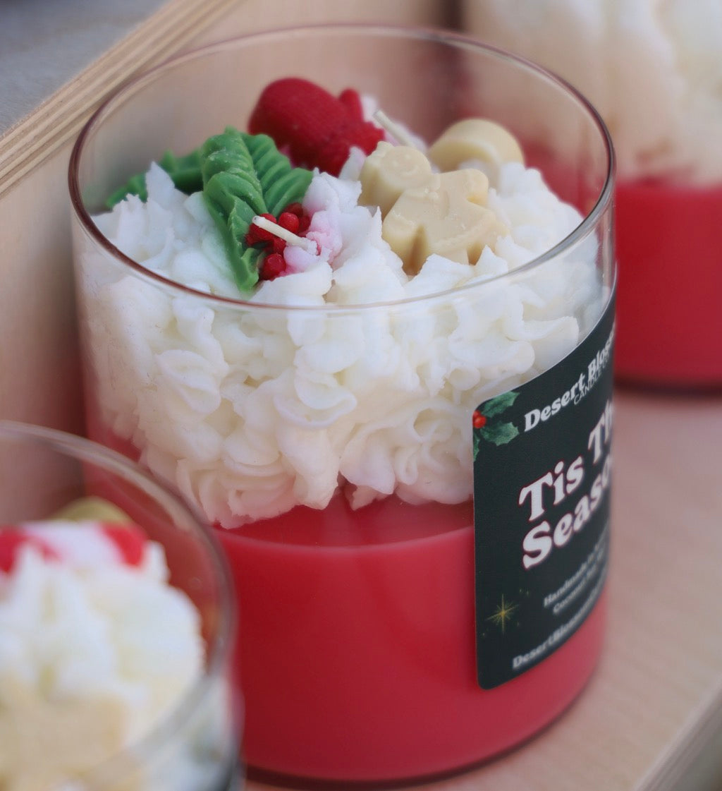 Each candle is hand poured in small batches with 16 ounces of coconut soy wax and is topped with festive holiday decorations including a holly sprig, a tiny Christmas tree, and a gingerbread man. Every detail is crafted to make this candle feel like a keepsake.